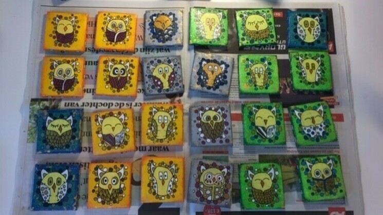 We zijn hier niet alleen druk bezig met uiltjes tekenen en schilderen... we tellen ze ook! 'Hallo Elke' zegt Nick als hij het atelier binnenkomt 'hoeveel uiltjes vandaag?'. 'Doet u mij er maar twaalf meneer' zeg ik dan. 'Okay Elke' roept Nick en in no time heeft hij de eerste klaar (nou ja klaar... de tekening 'staat', het inkleuren duurt een stuk langer). Dat is één. Nummer twee is aan de beurt en zo krijgt ieder uiltje een getal.