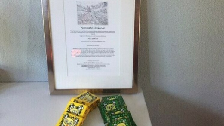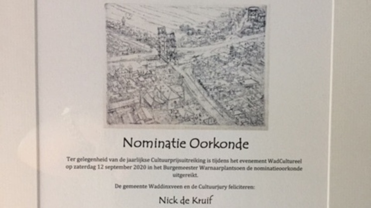 Afgelopen zaterdag nam Nick vol trots een schitterende oorkonde in beslag die hij als genomineerde voor de cultuurprijs Waddinxveen kreeg. De hoofdprijs ging naar iemand anders, maar die gunden wij het van harte want voor Nick was de dag al helemaal goed. Wat een hele mooie ingelijste oorkonde en al zijn fans waren er om hem te feliciteren en te trakteren op poffertjes na de uitreiking!