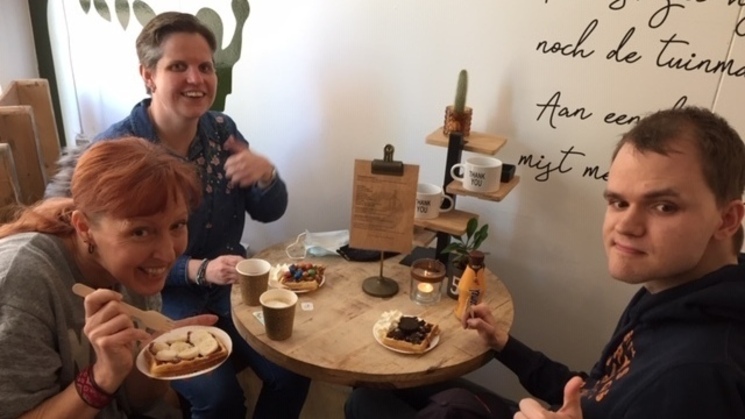 16 april 2021 16:20Vandaag gingen we op bezoek bij een deelneemster van het atelier die ook ergens anders creatief bezig is. Zij maakt heerlijke wafels in de keuken bij Jantje Zag Eens Pruimen Hangen in Gouda. Zij hebben ook een geweldige webshop trouwens: